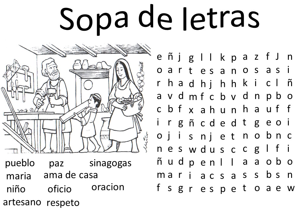 Jose, el padre terrenal de Jesús, era artesano y Maria, su madre, se ocupaba de los quehaceres de la casa, Jesús creció amando a su madre y a Jose. Luego de leer el texto de la ficha, los niños pueden jugar haciendo esta sopa de letras: